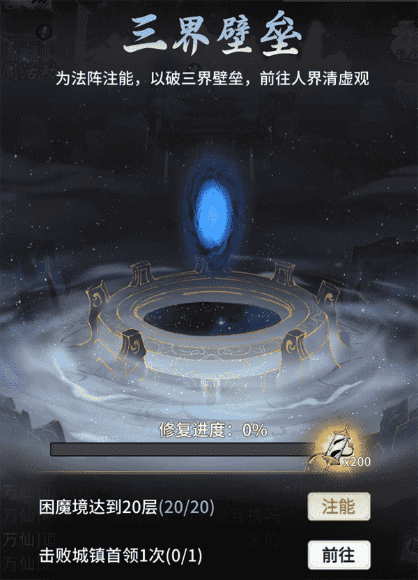 当你修为达到返虚/破虚中期后,,,可在城镇寻得芸丫并激活神秘法阵,,通过收集材料、、、击败首领等方式为法阵注能,,,,借以打破三界壁垒,,开启支线剧情“清虚旧梦”