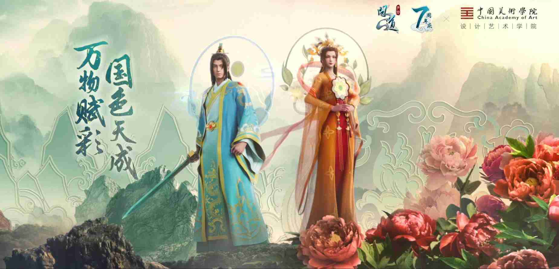 2023年4月,,,《问道手游》联动中国美术学院,,,,在游戏中融合了中国历史上不同时期的文化元素,,,打造了“山河万象”与“凤鸣九霄”的国风时装。。在色彩配置方面,,创作团队基于对游戏角色特性的分析提取相应的文化内涵,,,从每一种色彩的色相、、、指代事物和情感出发对应角色属性,,,选定服装的色彩搭配。。在纹样设计方面,,,创作团队结合游戏角色自身特殊的造型比例和形态,,,在实际的纹样设计中进行了游戏语境下的活化演绎。。男性角色集中使用了如蟒纹、、、、海水江崖纹、、、如意纹和云气纹等传统纹样元素,,女性角色则吸纳了凤凰纹、、、、牡丹纹、、、、卷草缠枝纹等元素,,,,组成以“双凤牡丹纹样”“缠枝牡丹纹”“金玉凤冠头饰”为主要纹样的游戏角色装饰图案系统。。
